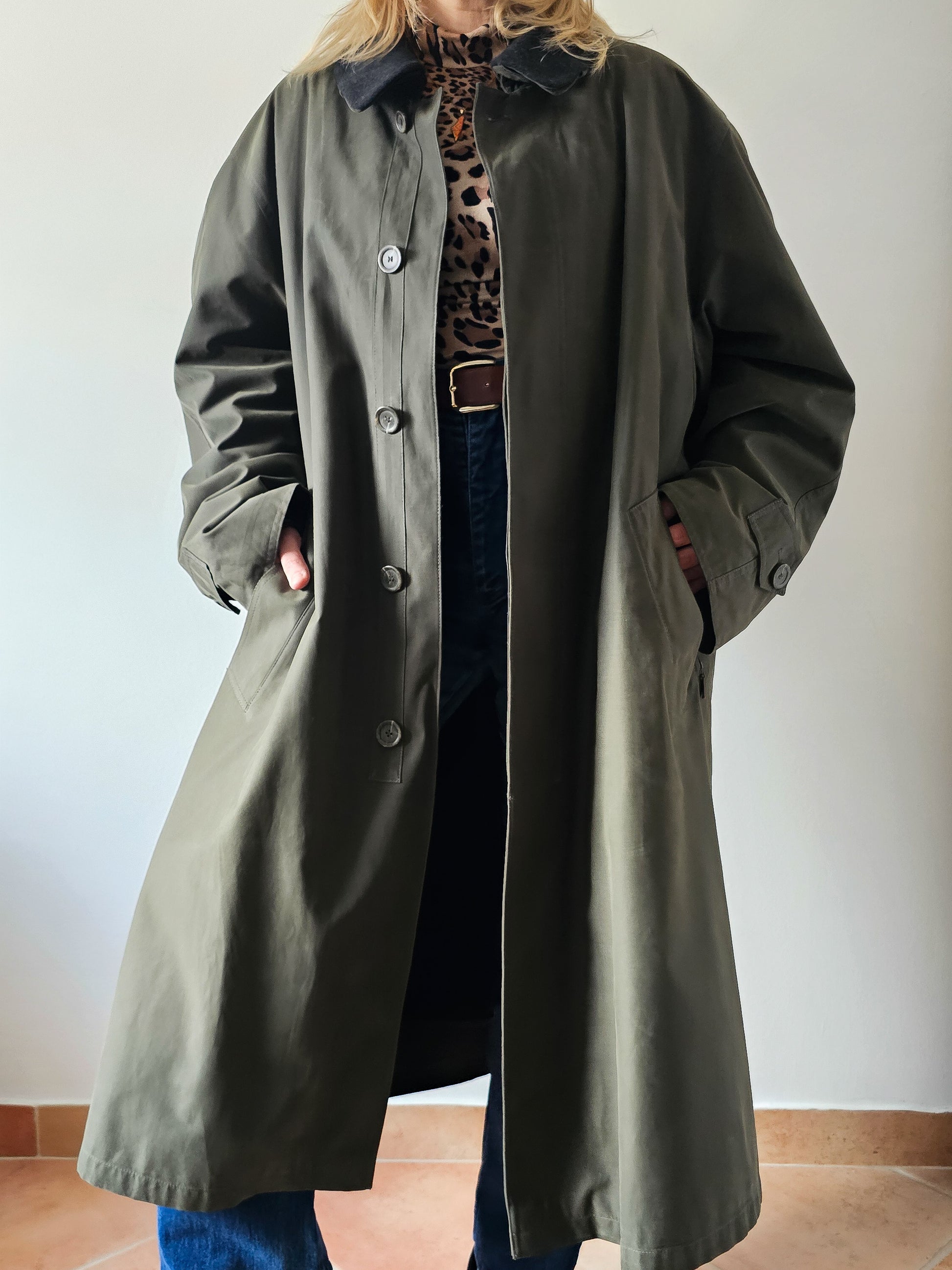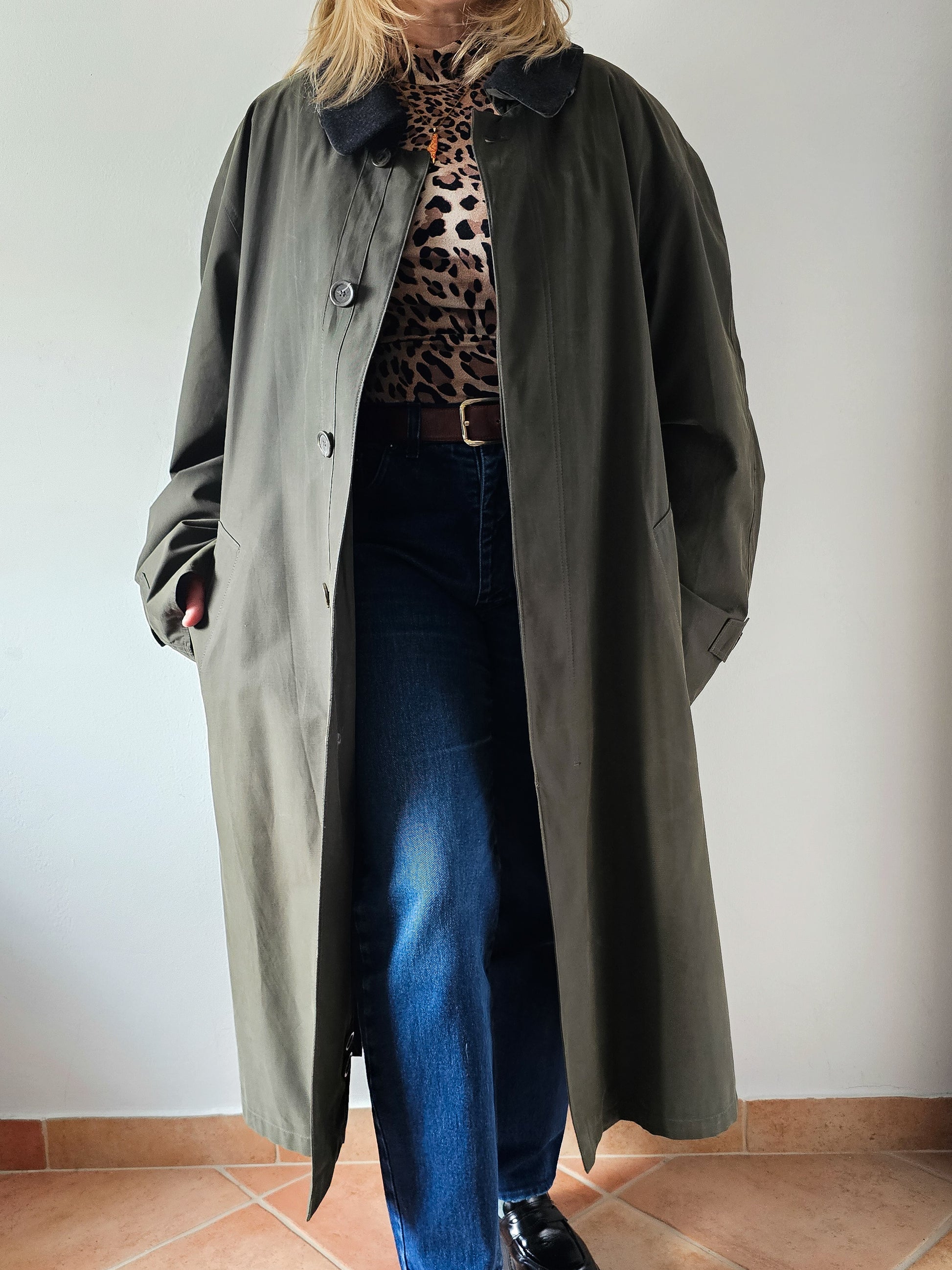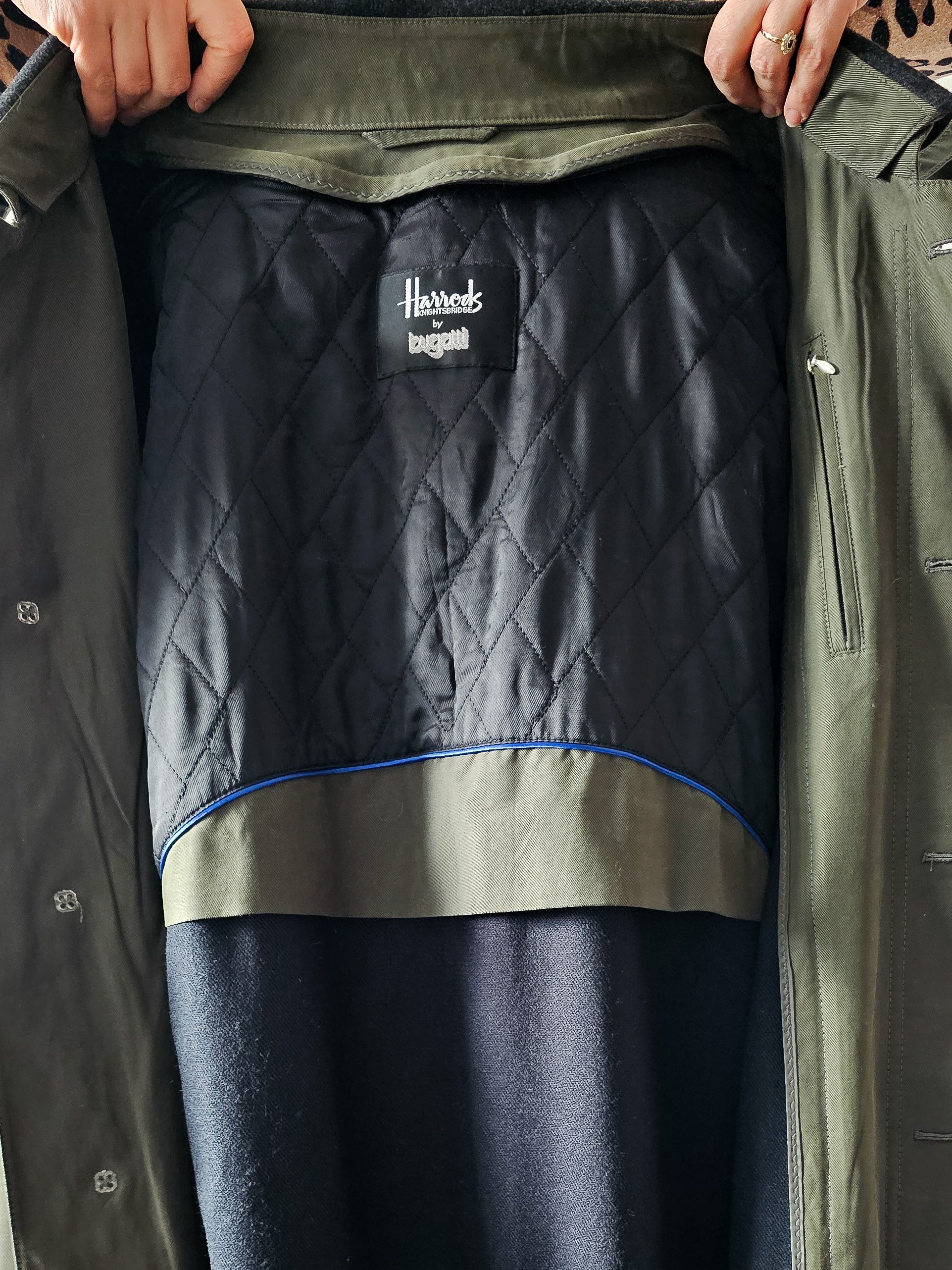 Moški trenč iz 90. let, znamke Harrods Knightsbridge. Izdelan v Nemčiji (izdelal ga je Bugatti za prestižno londonsko veleblagovnico Harrods). Ima snemljivo podlogo - primeren za jesen, zimo in pomlad.