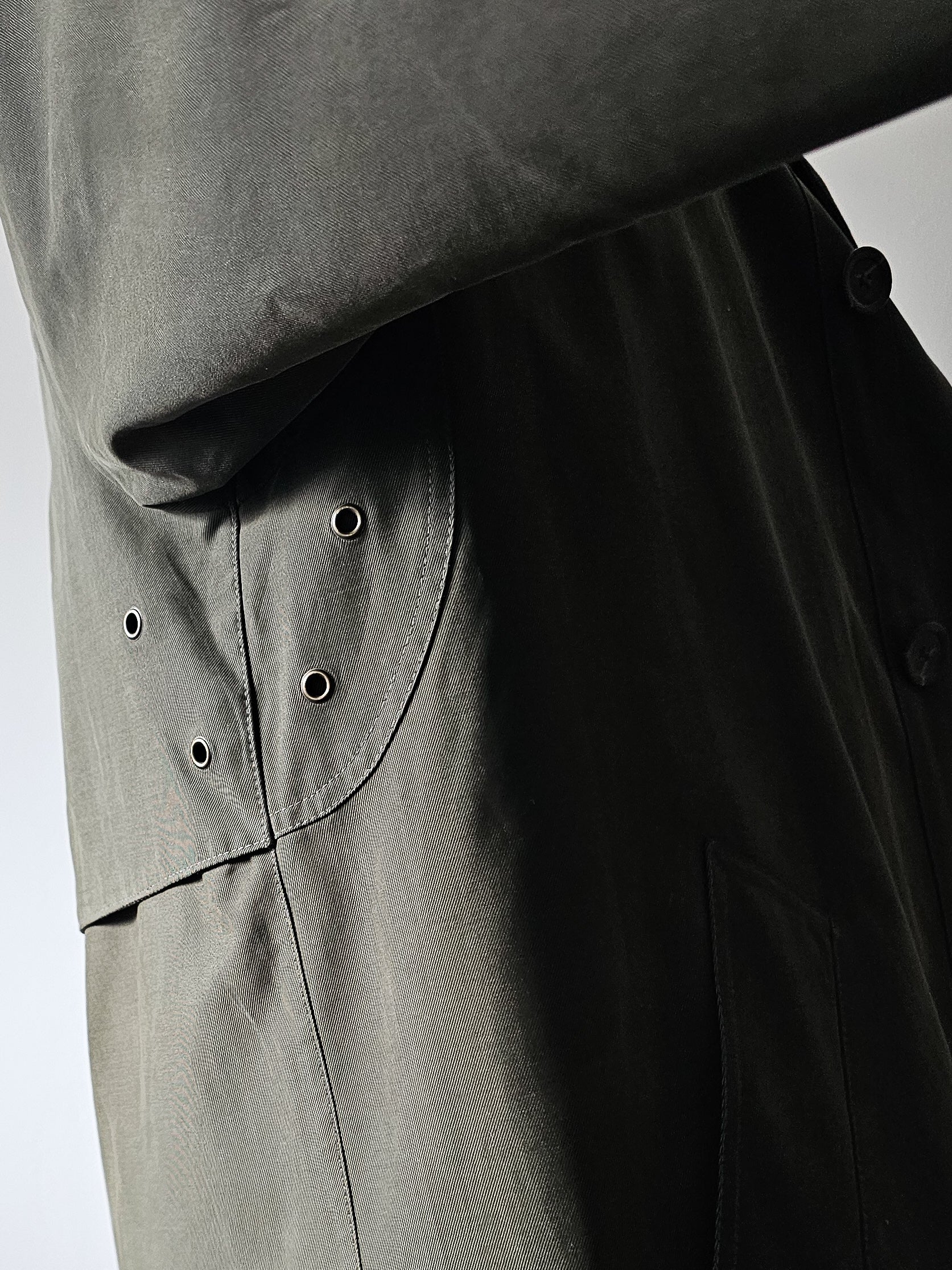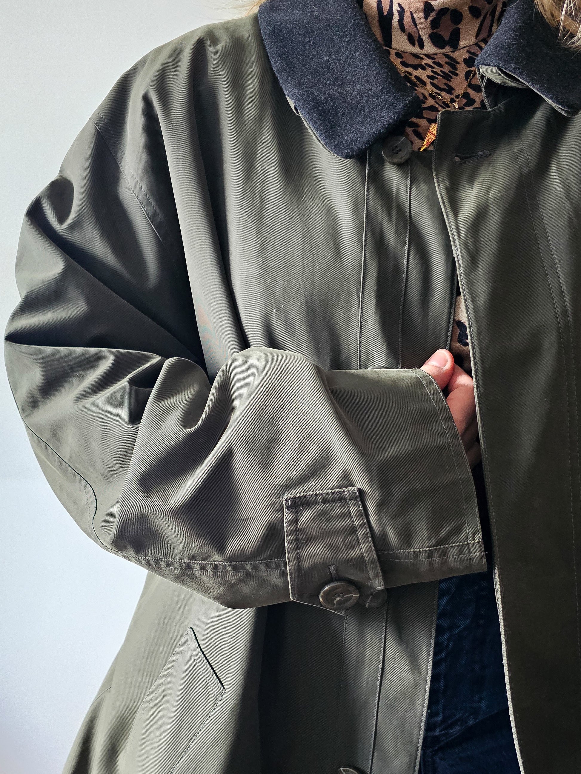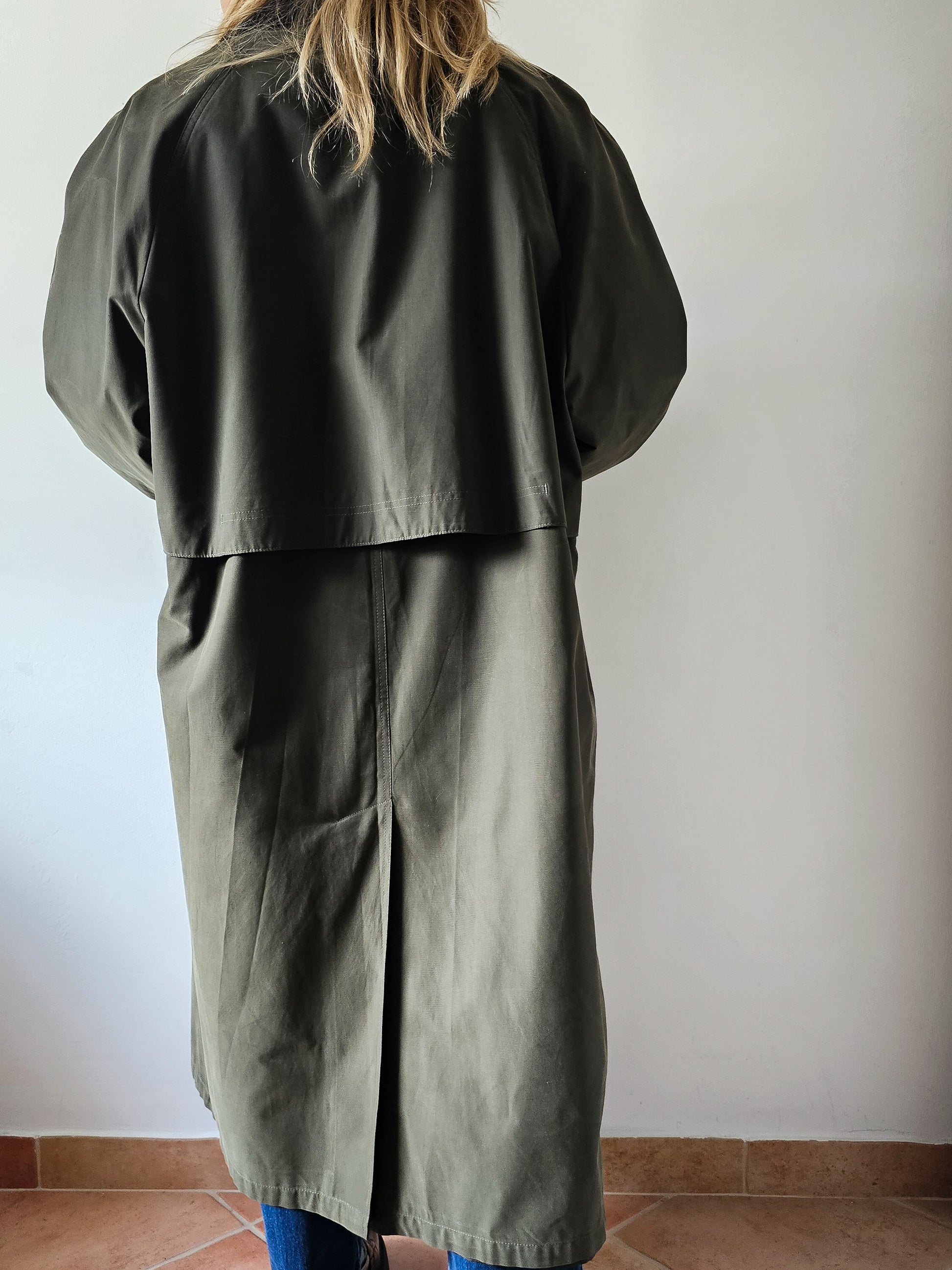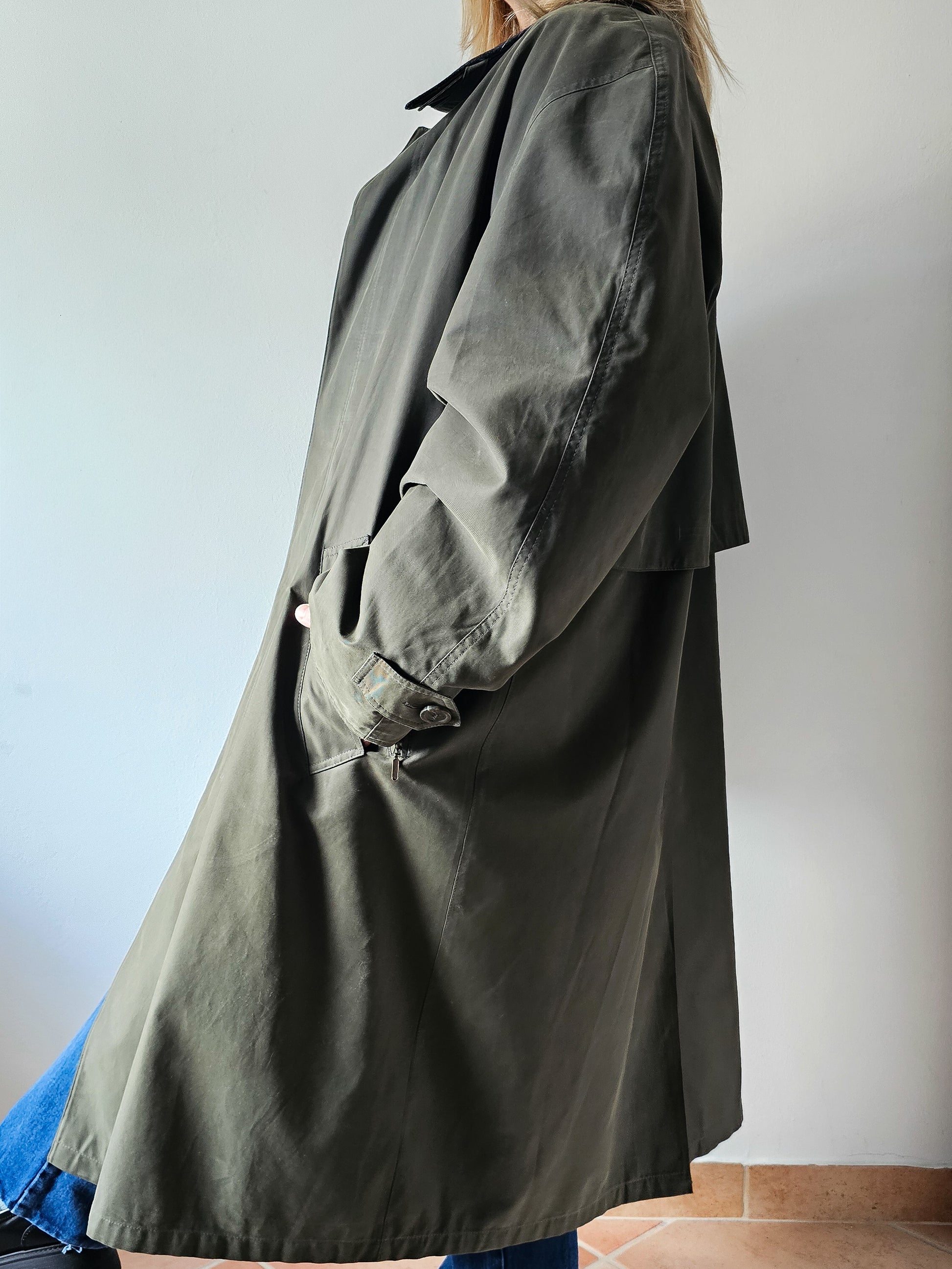 Moški trenč iz 90. let, znamke Harrods Knightsbridge. Izdelan v Nemčiji (izdelal ga je Bugatti za prestižno londonsko veleblagovnico Harrods). Ima snemljivo podlogo - primeren za jesen, zimo in pomlad.