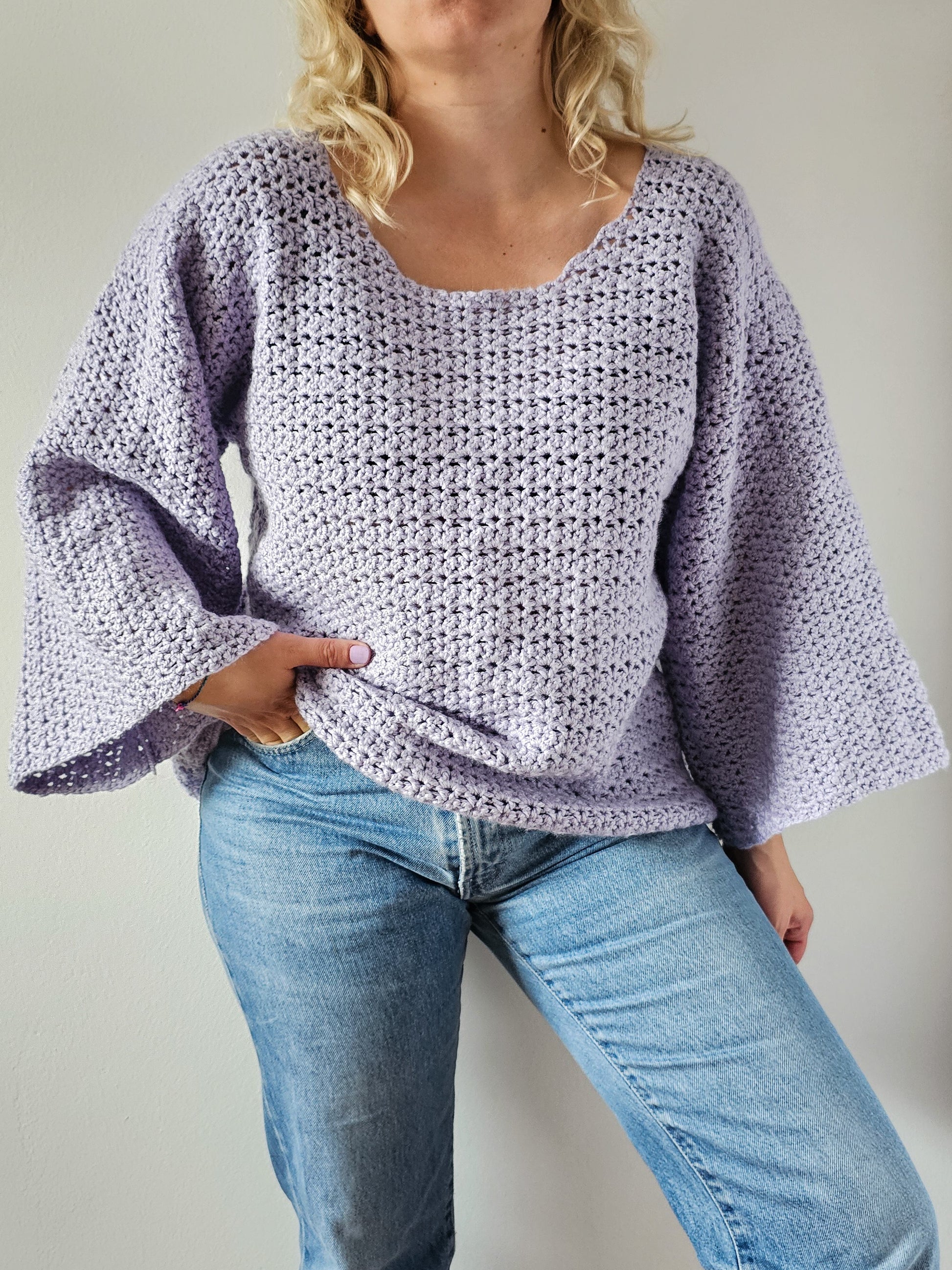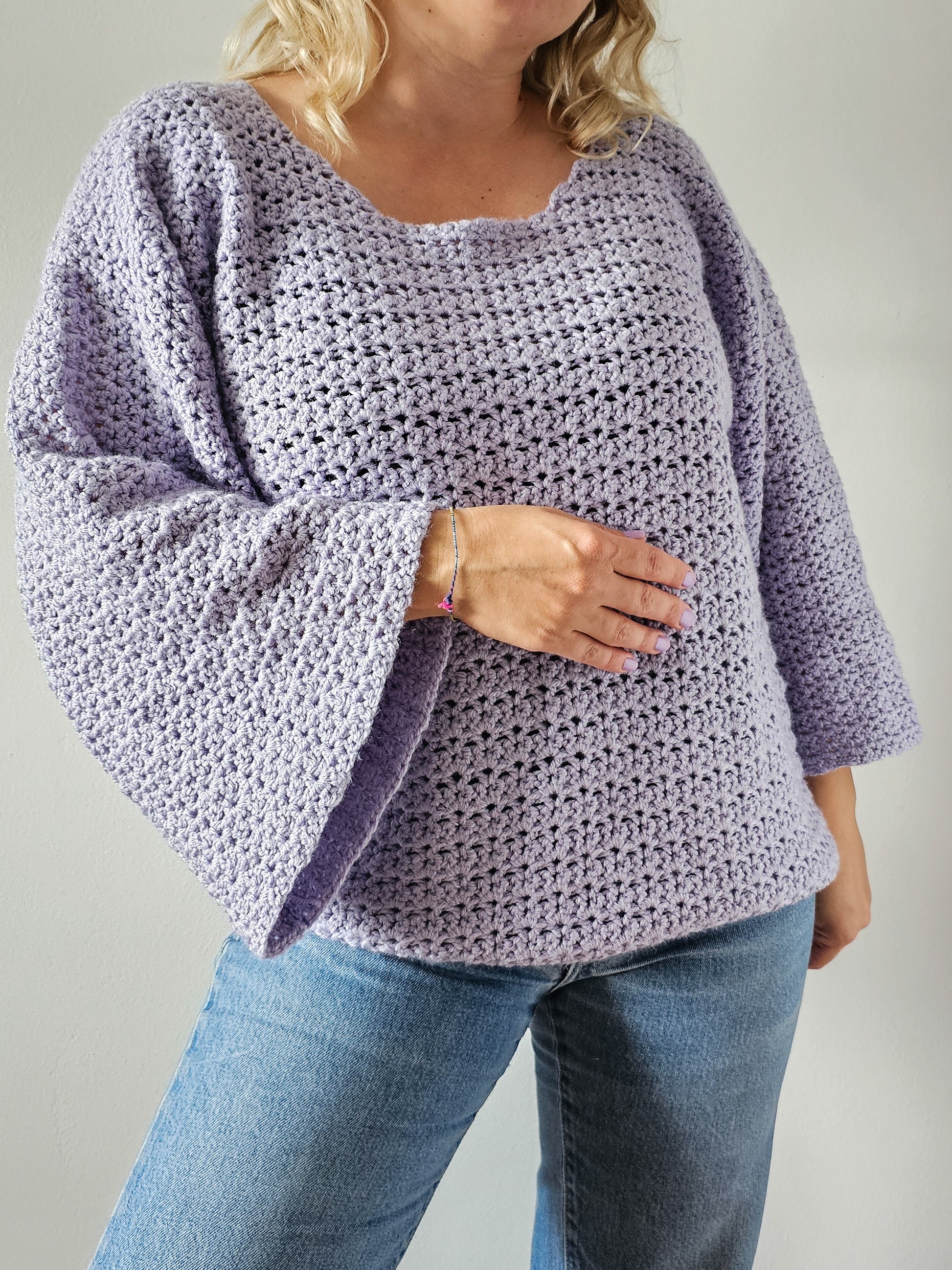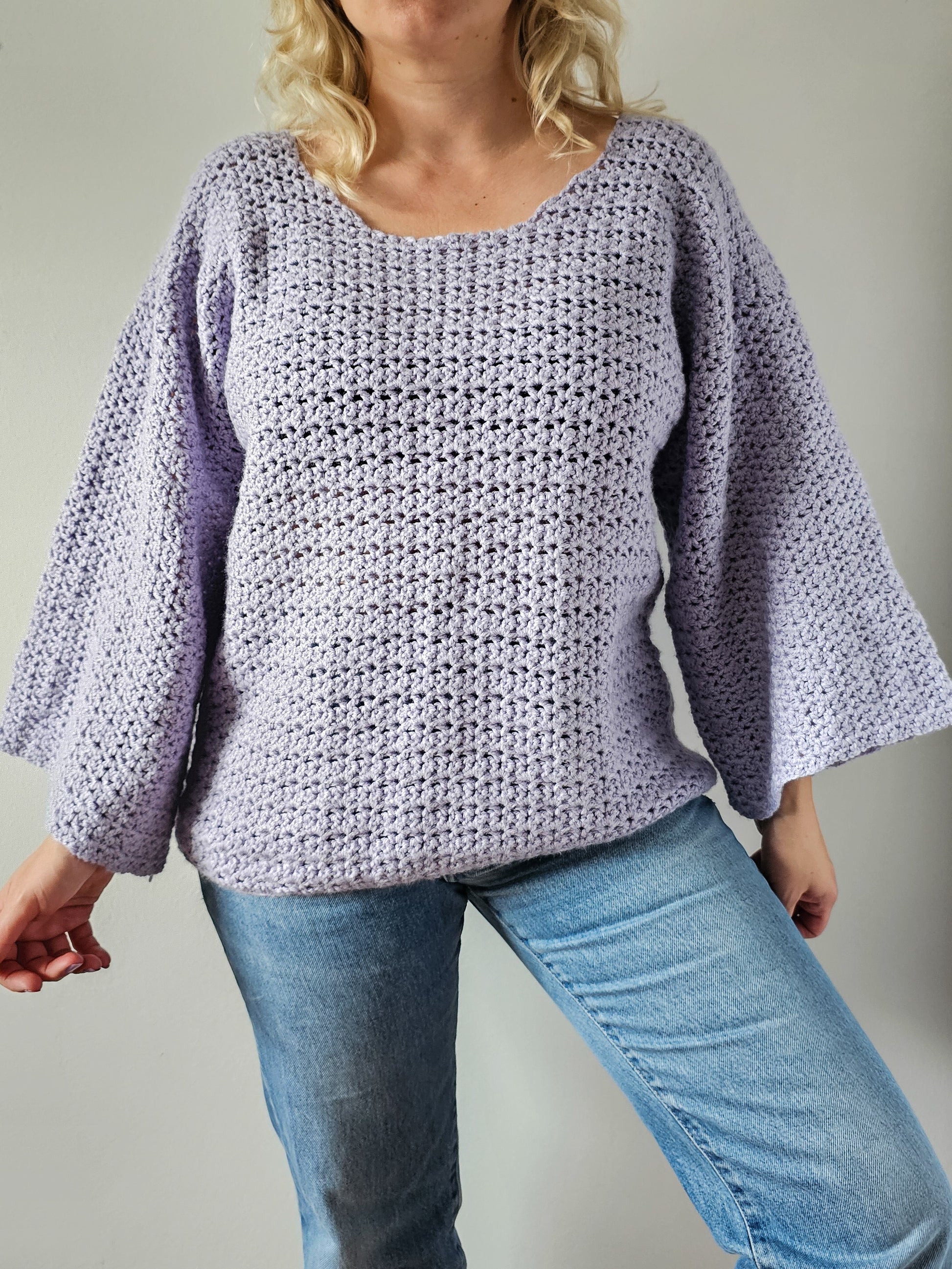 Kvačkan ženski pulover z zvončastimi rokavi. Ročno delo.