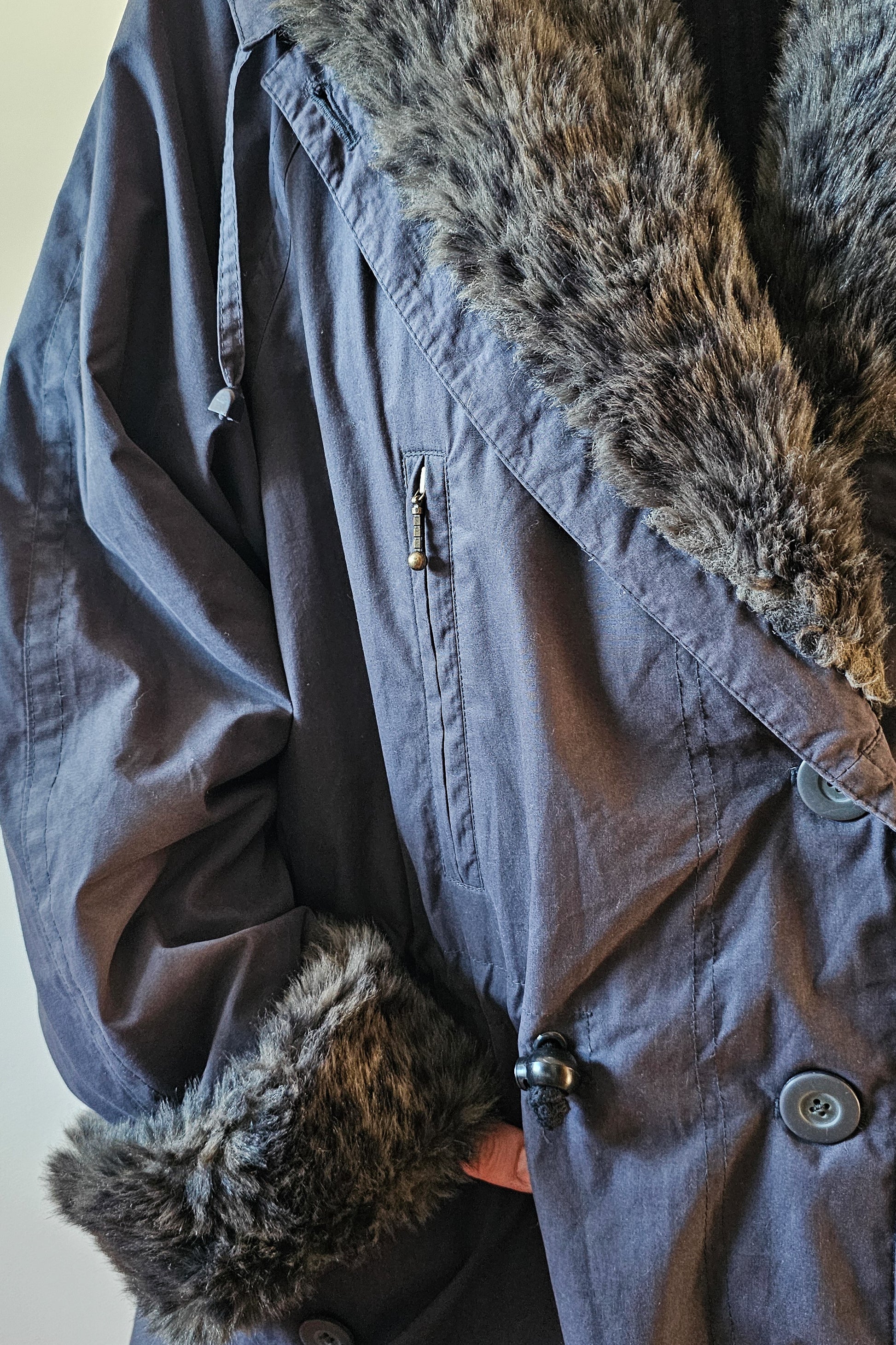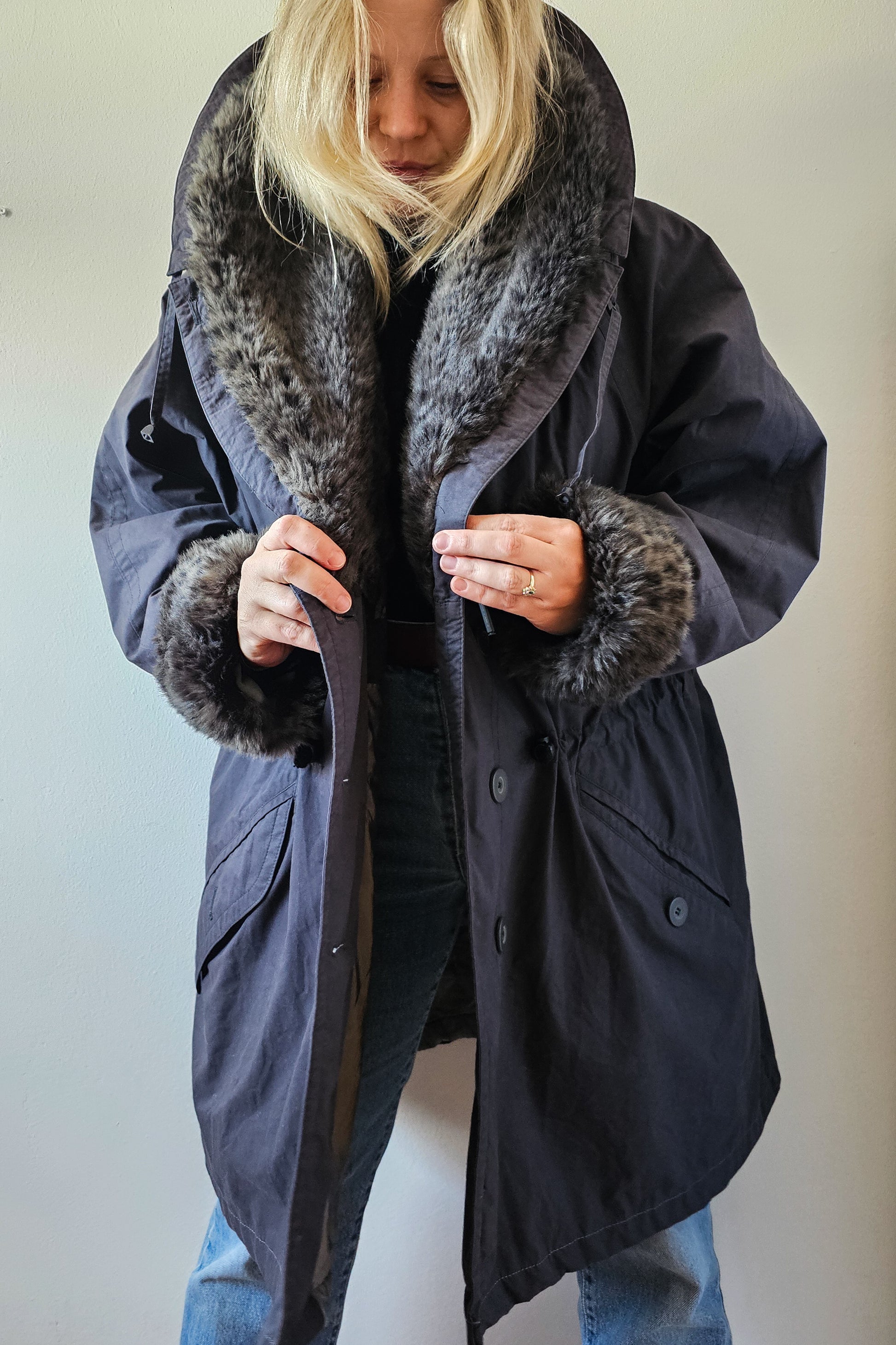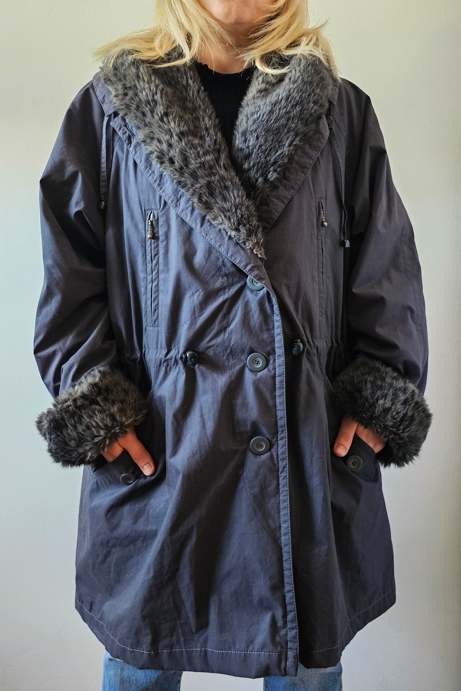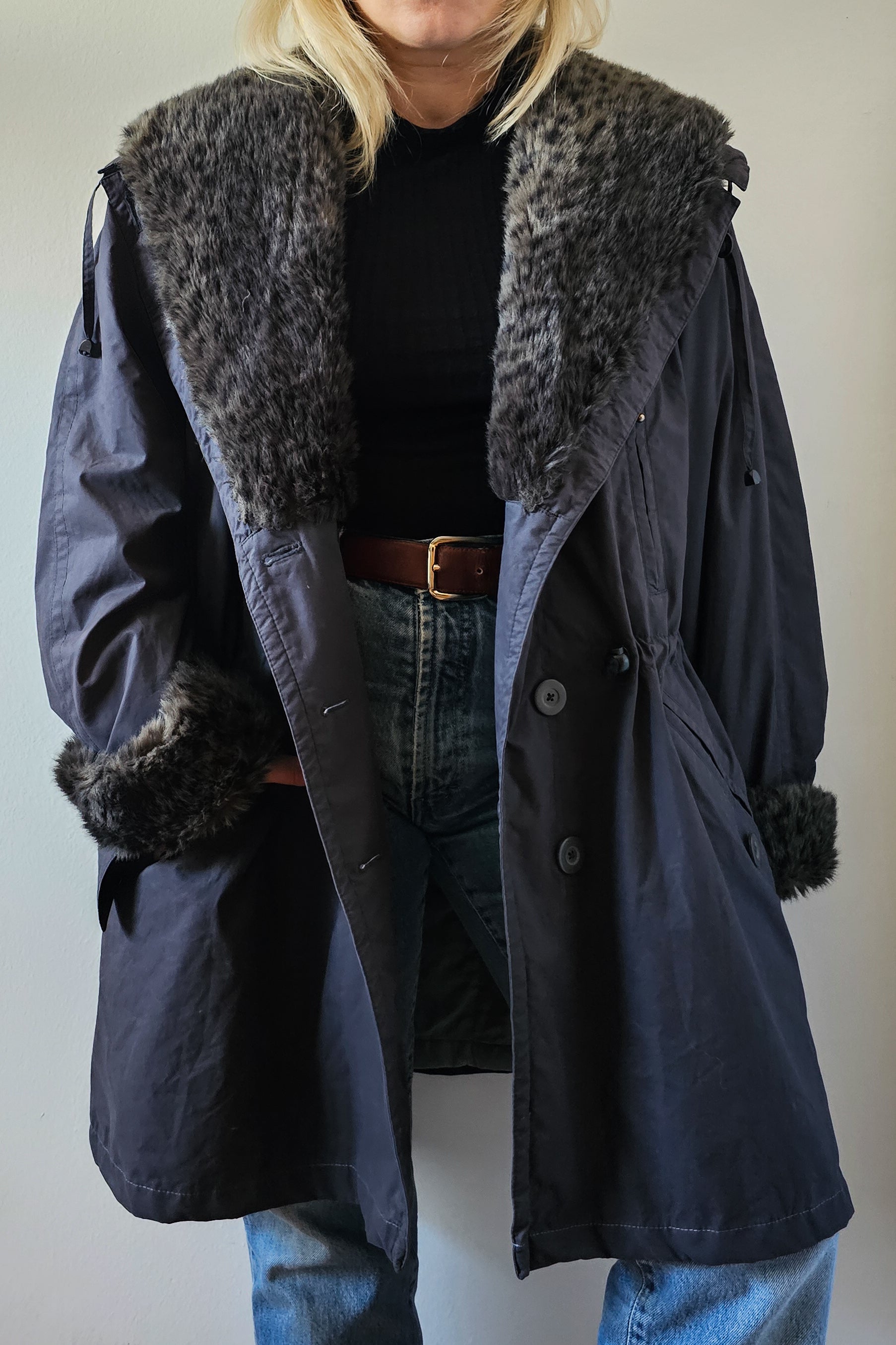 Ženski plašč s kosmatenim ovratnikom in zapestji ter nastavljivim pasom, znamke Saurer.